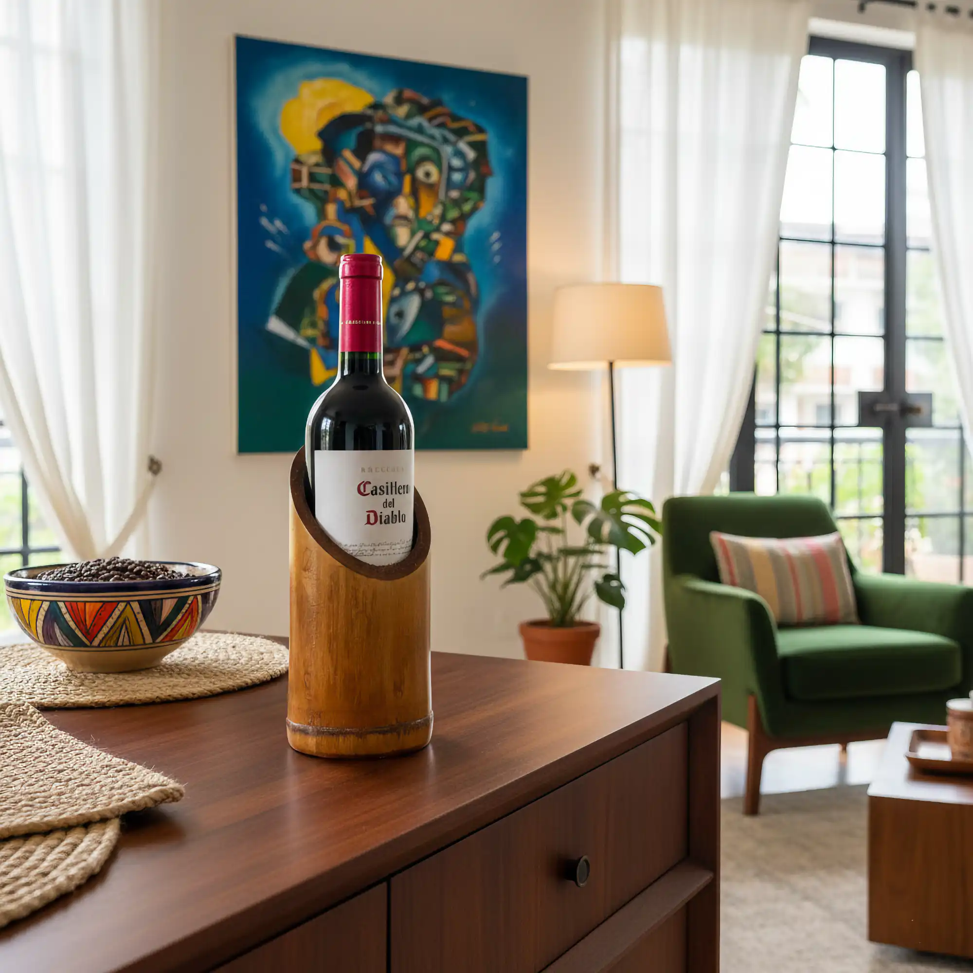 El Maridaje Perfecto entre Diseño y Física Eleva la experiencia de disfrutar un buen vino con nuestro Portabotellas de Equilibrio en Guadua – Edición Vino. Esta pieza artesanal transforma una sección de guadua seleccionada en una base flotante que desafía la gravedad, convirtiéndose en el centro de todas las miradas en tus cenas, catas y celebraciones.